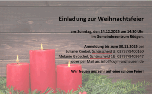 Wir laden unsere Mitglieder und Teilnehmer/innen der verschiedenen Gruppen, sowie die Mitglieder und Teilnehmer/innen der Ev. Gemeinschaft Anzhausen und der Ev. Frauenhilfe Anzhausen zu unserer gemeinsamen Weihnachtsfeier ein. Sie findet am Sonntag, den 14.12.2025 um 14:30 Uhr im Gemeindezentrum Rödgen statt.